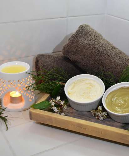 Start experience by applying our unique two in one exfoliating body polish and cocooning mask. This detoxifying mask draws out impurities and promotes healthy circulation. Leave this on while you sit back and relax within the aromatic 40°C warmth of the steam room. To conclude apply our deeply nourishing and hydrating Body Butter.